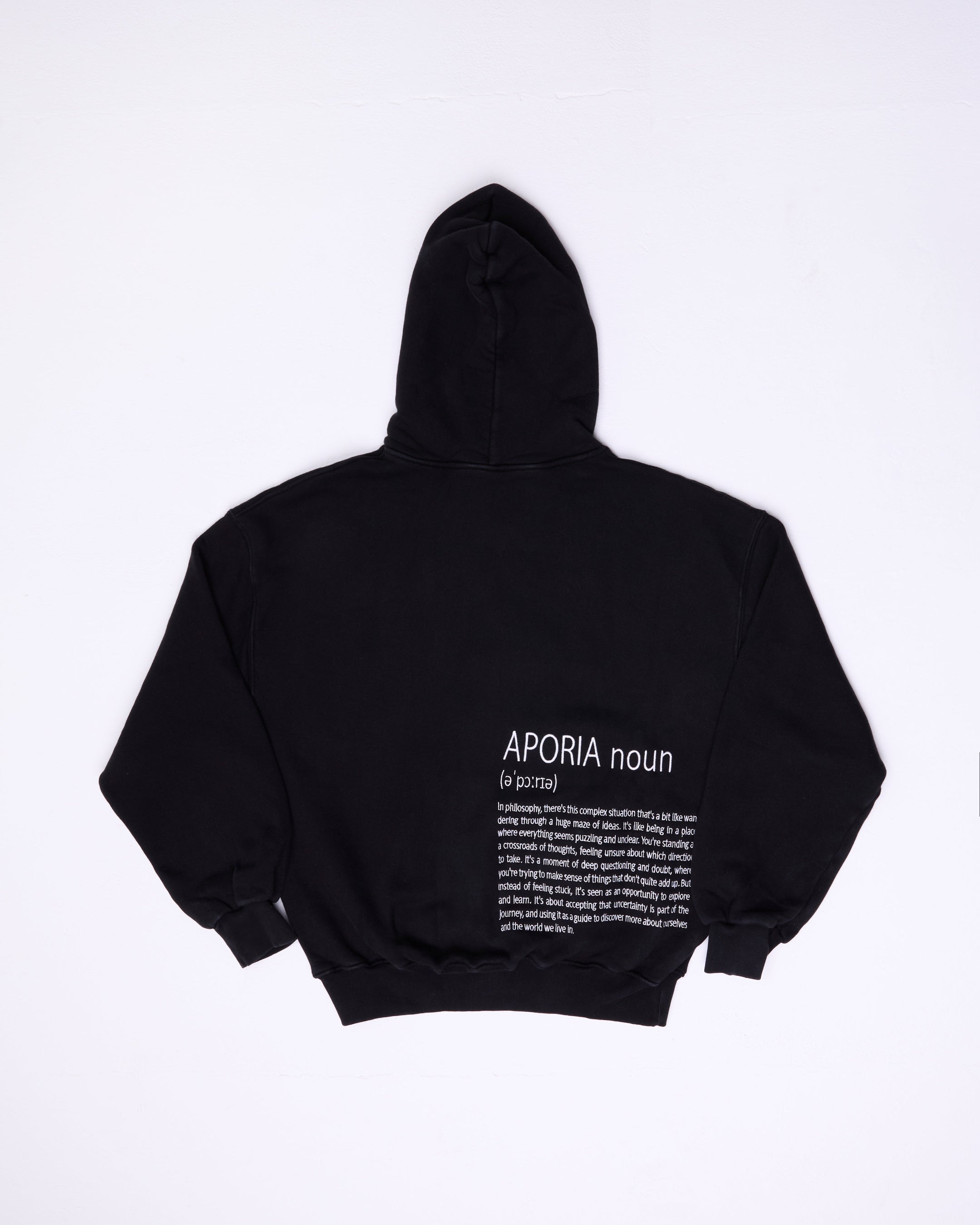 Our very original Aporia hoodie, a clean, timeless 450 gsm piece that represents the core of the brand. Featuring our signature wave design embroidered on the front and the definition of Aporia detailed on the back, this hoodie blends meaning with minimal style. Its oversized yet boxy fit is balanced by tight ribbing at the cuffs and waistline for a sharp, structured look. Made from ultra-soft preshrunk cotton fleece and dyed with natural colours, it delivers comfort, durability, and a premium feel that lasts. Perfect for everyday wear and for those who appreciate thoughtful design.